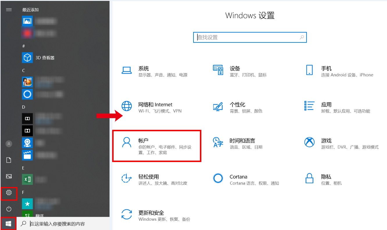 点击 Windows 图标 > 设置图标,选择“帐户”。