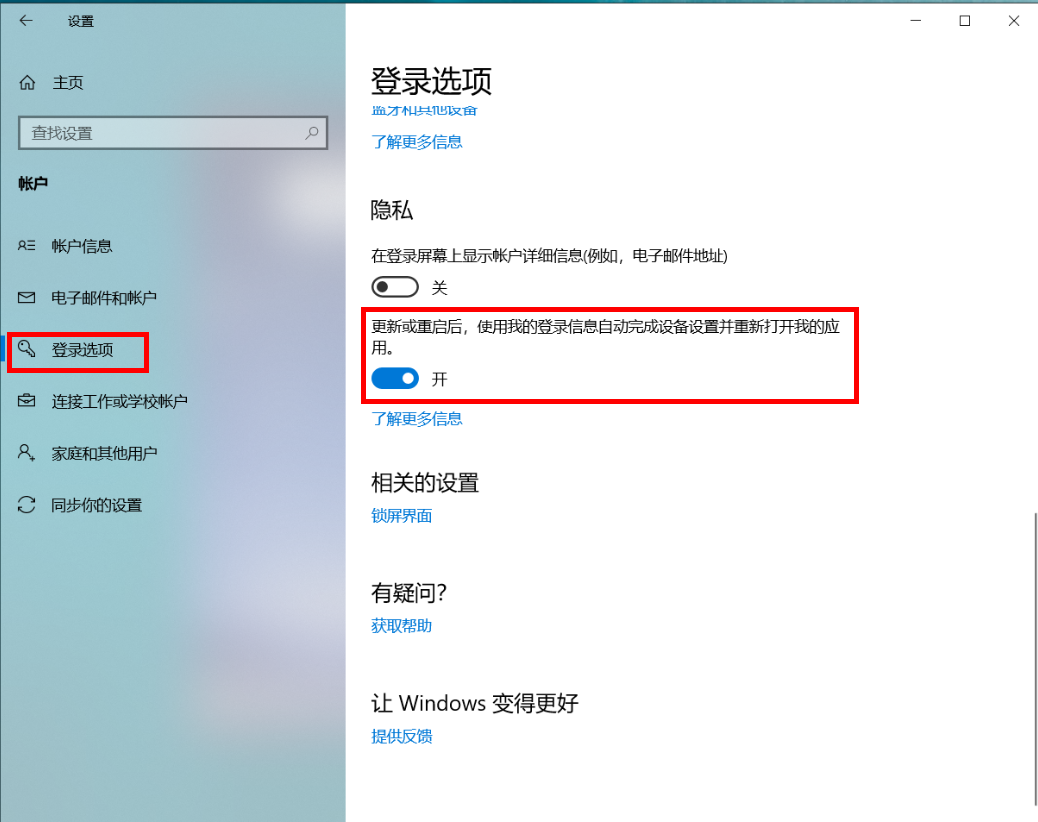 点击“登录选项”,在“隐私”下关闭“更新或重启后,使用我的登录信息自动完成设备设置并重新打开我的应用”。