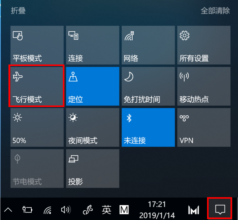 若要打开/关闭飞行模式,请选择任务栏上的操作中心图标,点击“飞行模式”。