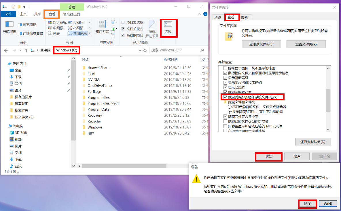 (1)同时按下 Win + E 键打开文件资源管理器,选择 C 盘。点击“查看 > 选项”。在“文件夹选项”窗口中点击“查看”,取消勾选“隐藏要保护的操作系统文件”,在弹出的警告中选择“是”,最后点击“确认”。