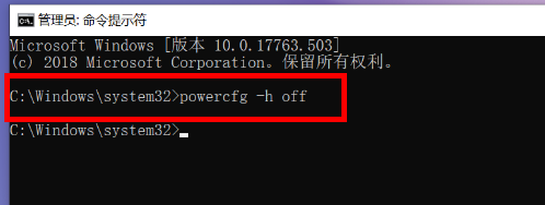 - 输入命令 powercfg -h off,按 Enter 键确认,您会发现 C 盘中的 hiberfil.sys 文件被删除。