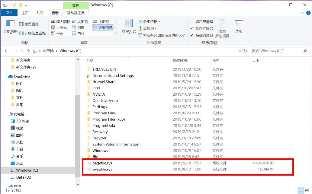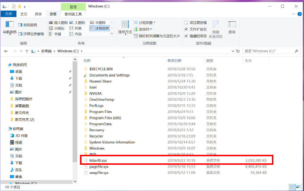 (2)您将在 C 盘中看到休眠文件 hiberfil.sys。
