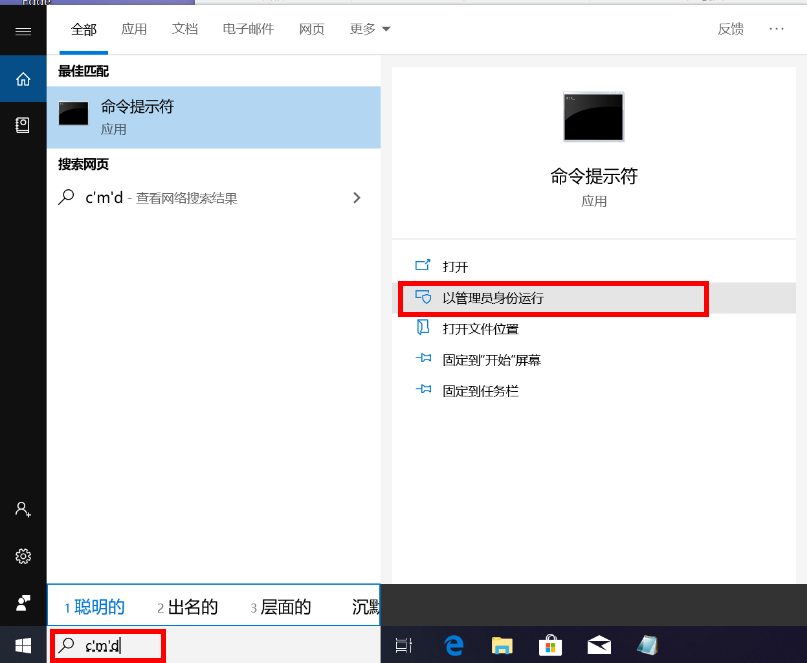 - 在任务栏搜索框中输入 cmd,并选择“以管理员身份运行”。