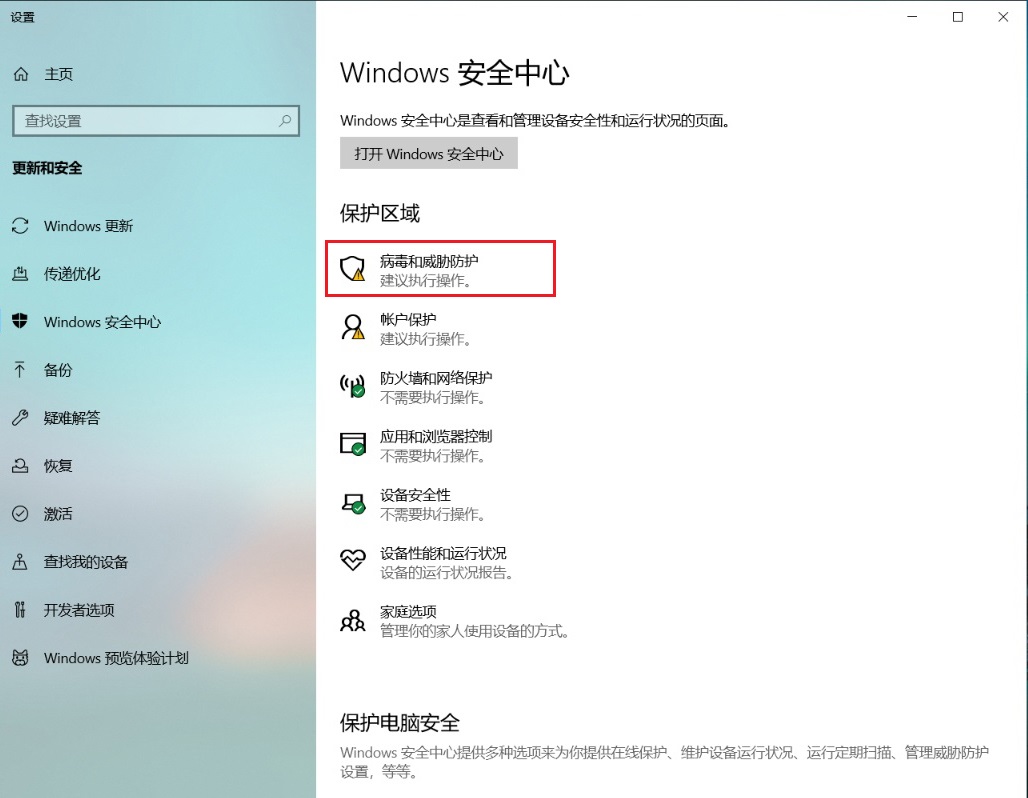 - 点击“病毒和威胁防护”。