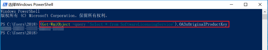 - 输入命令:(Get-WmiObject –query ‘select * from SoftwareLicensingService’).OA3xOriginalProductKey,按回车键,可查看到格式为XXXXX-XXXXX-XXXXX-XXXXX-XXXXX 的Windows 操作系统产品密钥。