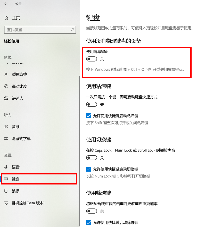 同时按下“Win + Ctrl + O”键可以打开或关闭“屏幕键盘”。