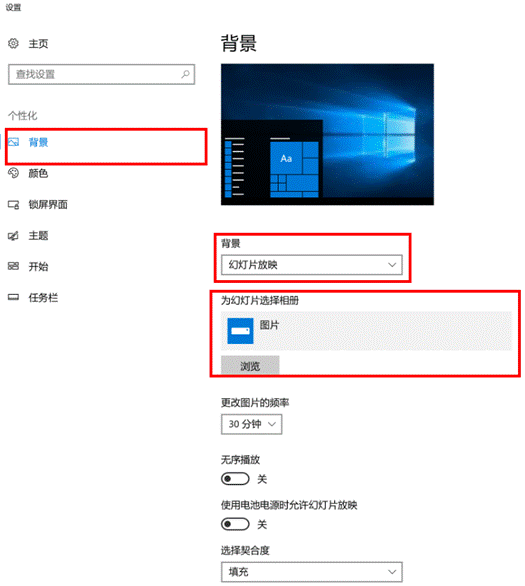 点击“背景”,在“背景”下拉列表中选择“幻灯片放映”,点击“浏览”并选中所要设置幻灯片的所有图片,可在预览窗口中预览设置效果。