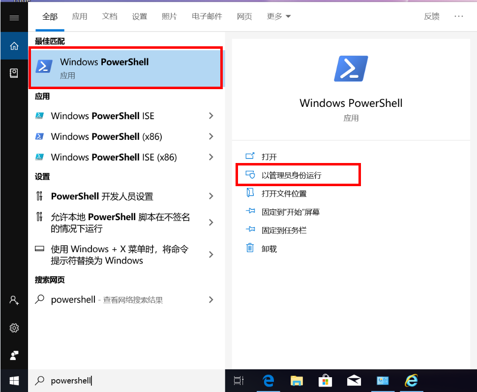 - 在任务栏搜索框中输入PowerShell,选择“Windows PowerShell”,并点击“以管理员身份运行”。
