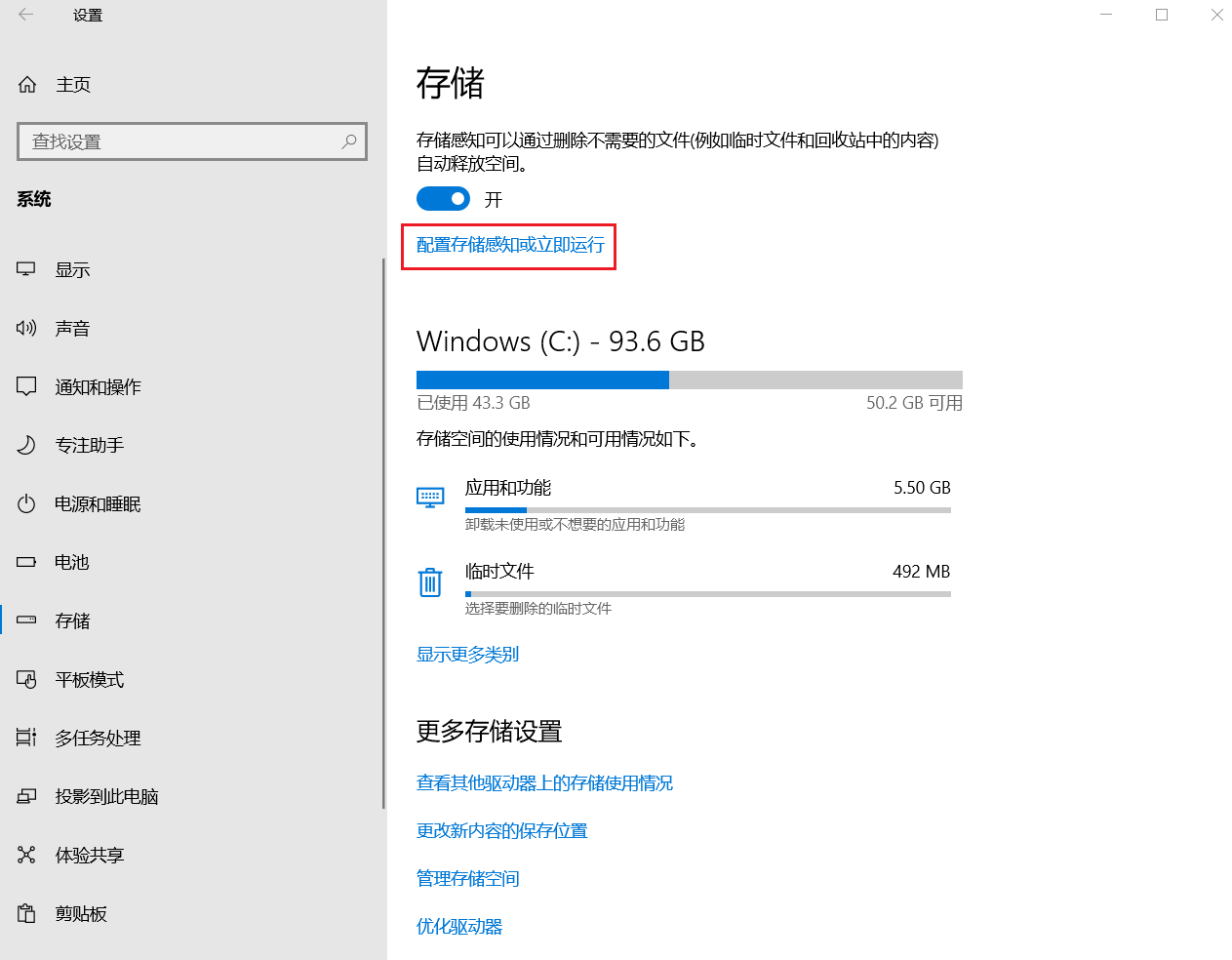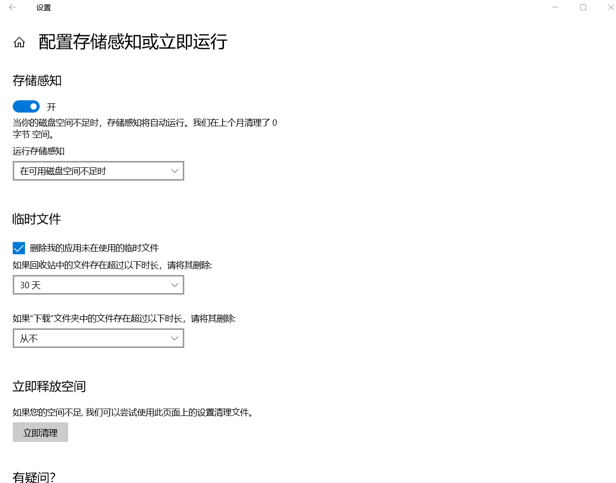 点击“配置存储感知或立即运行”,可选择释放空间的方式。运行存储感知可根据需要设置为每天、每周、每月或在可用磁盘空间不足时。