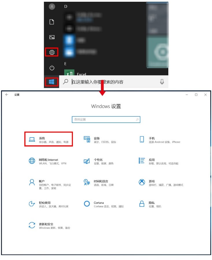点击 Windows 图标 > 设置图标,选择“系统”。