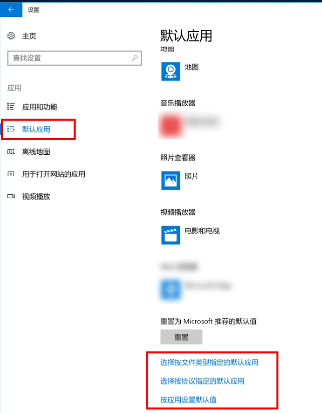 点击“默认应用”,然后按照您的需要,选择按文件类型或协议指定默认应用。