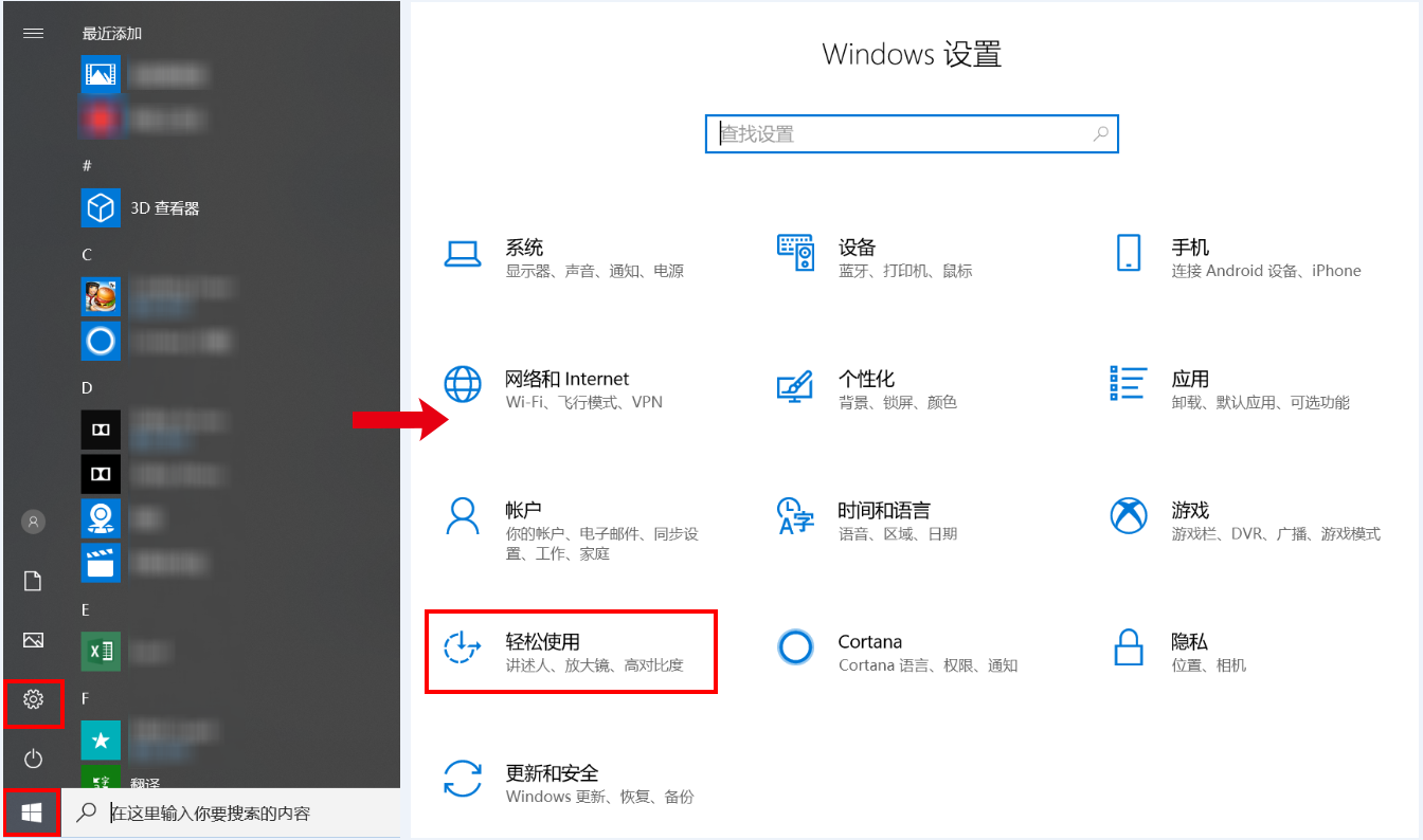 点击 Windows 图标 > 设置图标,点击选择“轻松使用”。