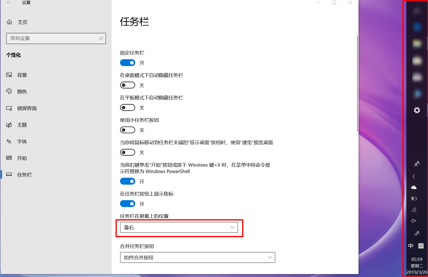 例如,选择“靠右”后,可以看到任务栏已经调整到屏幕右边。
