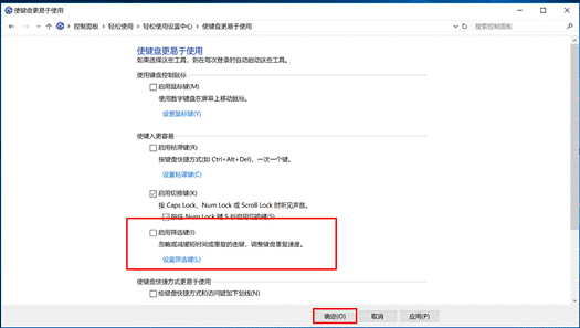 筛选键功能可以使 Windows 忽略短暂或重复的击键,也可以调整点击键盘的重复率(按下某个键时的重复性),避免意外击键。利用该项功能,您可以将计算机设置成适合自己习惯的击键速度。