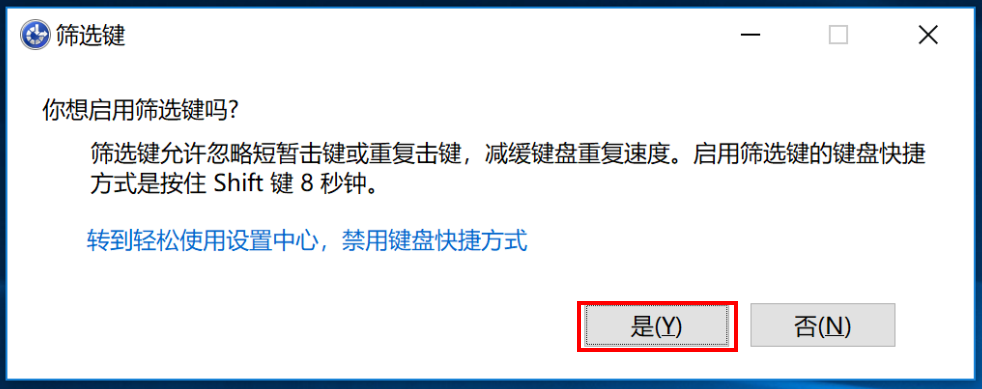 - 在弹出是否启用筛选键的提示框中,点击“Yes”,开启筛选键功能。