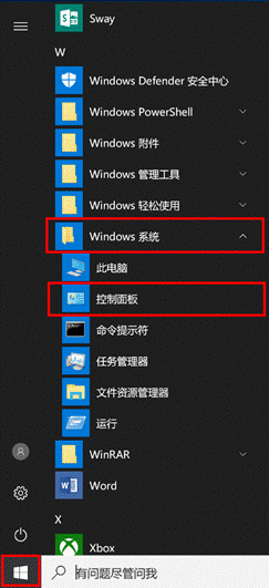 - 点击 Windows 图标,在列表中选择“Windows 系统”,在展开列中点击“控制面板”。