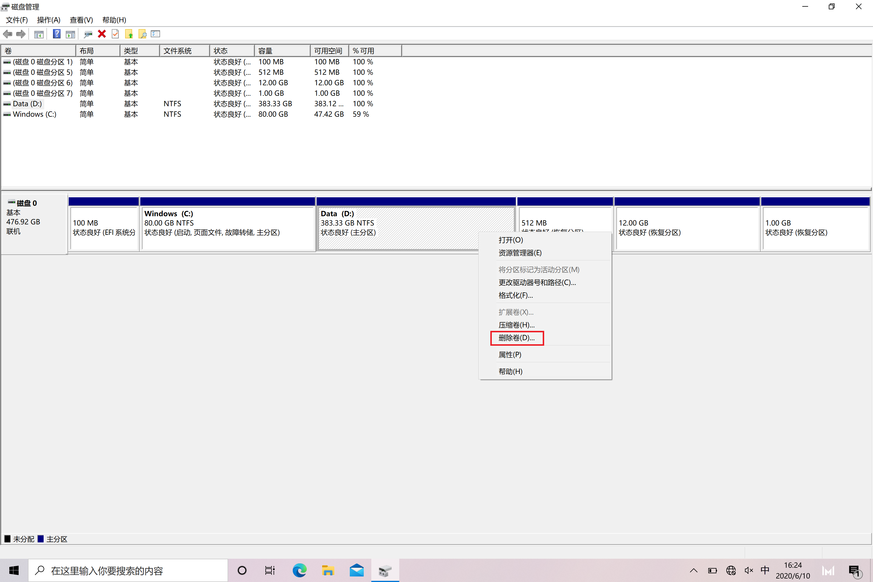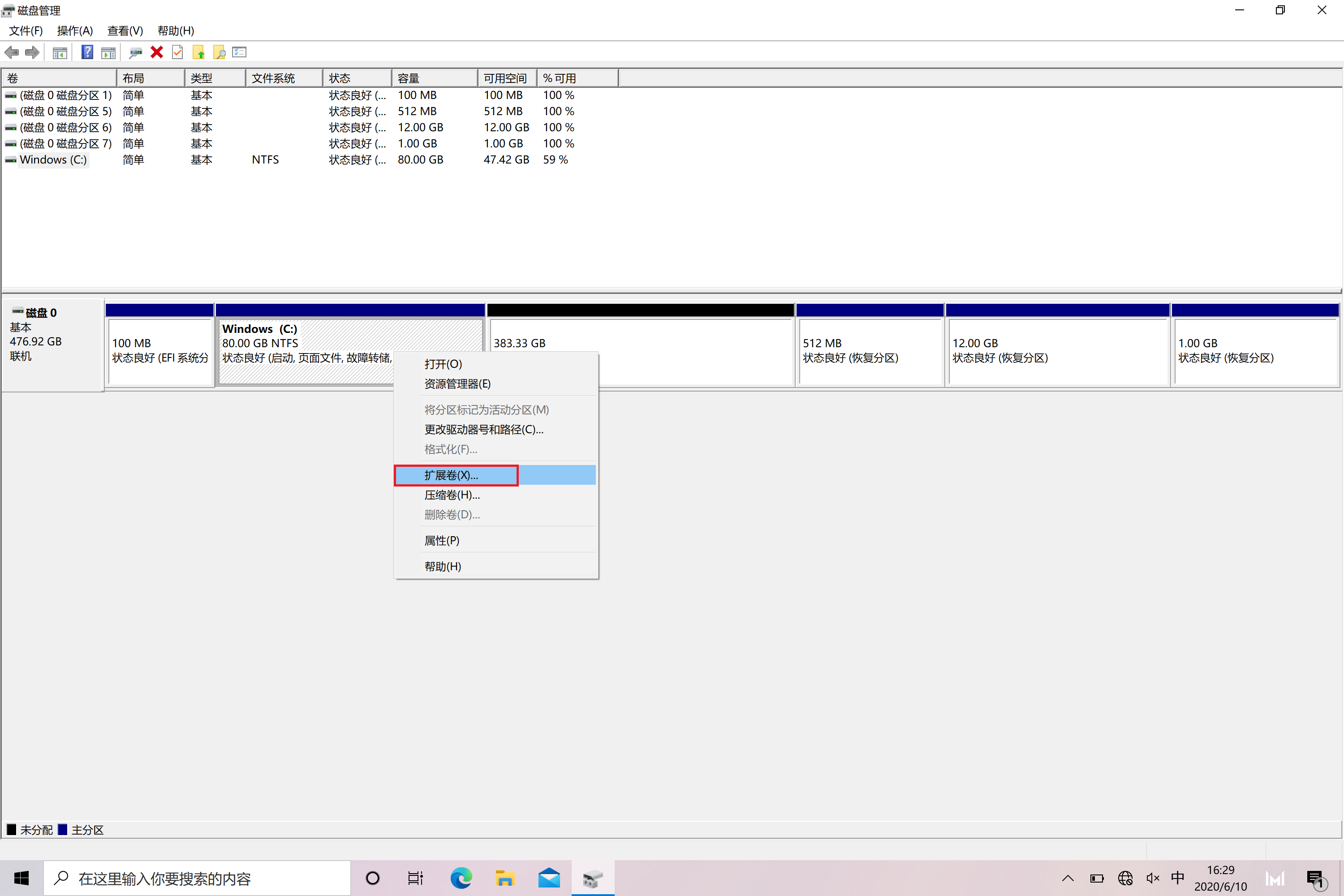 - 在弹出的“磁盘管理”窗口中,选择D盘,右键点击选择“删除卷”点击“确定”删除。删除卷后出现一个未分配的空间,选择C盘,右键选择“扩展卷”,在弹出的“新建简单卷”对话框中,根据提示完成扩展。此时D盘已合并到C盘。