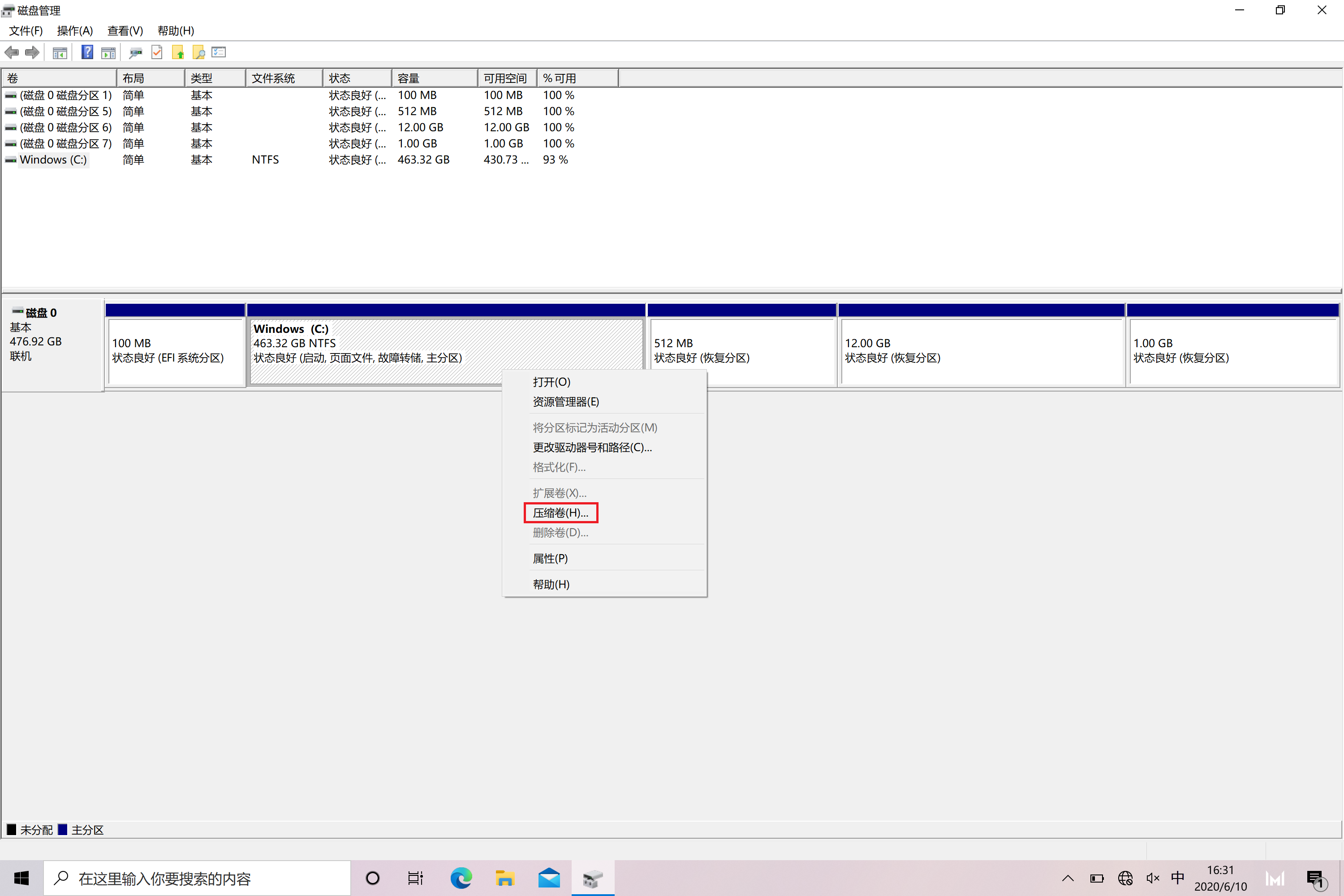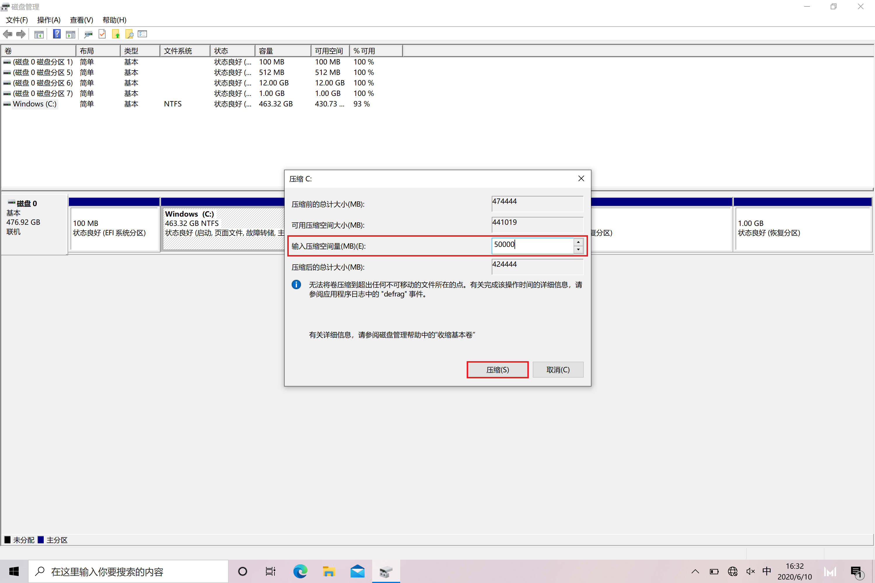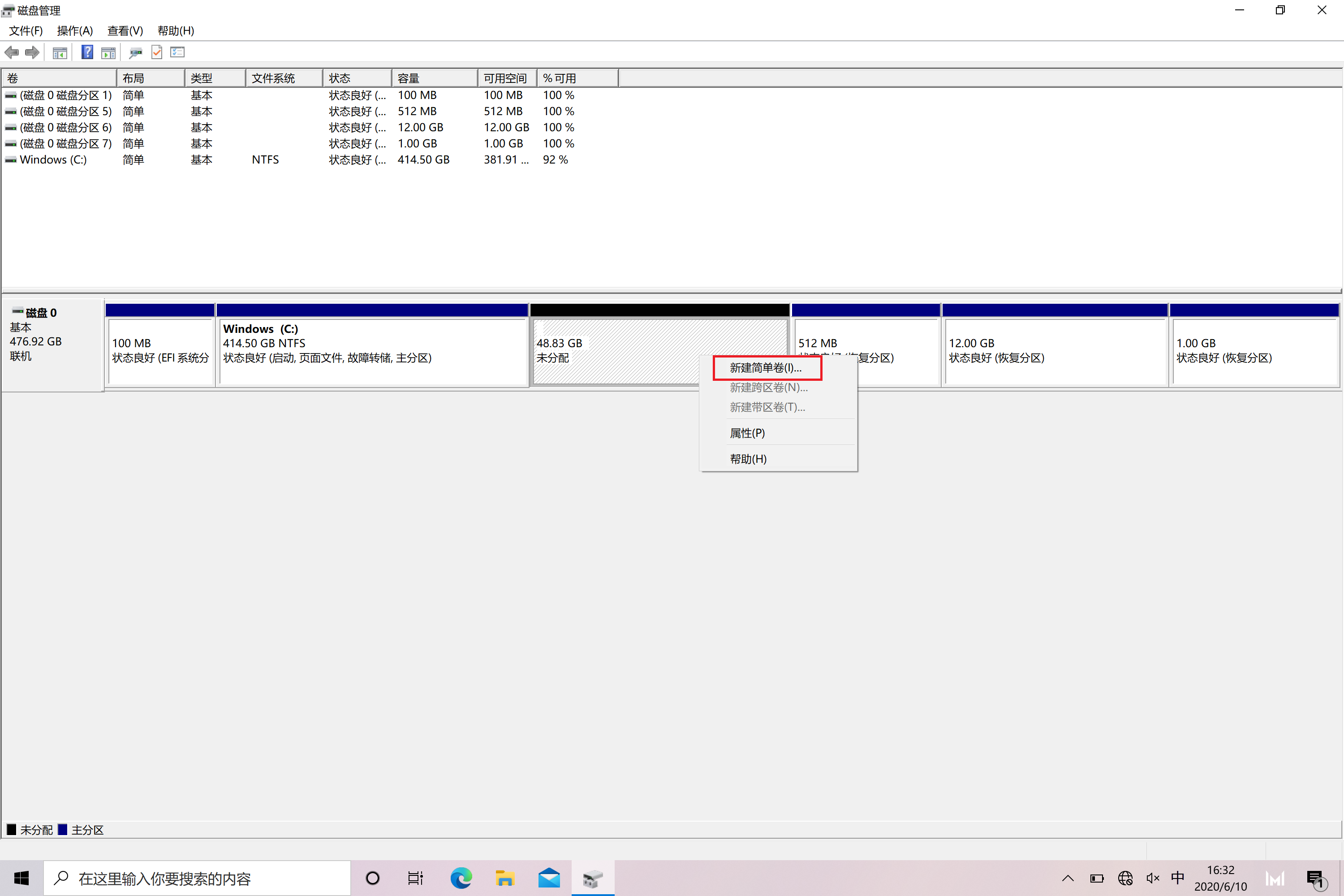 - 在“磁盘管理”窗口中,选择C盘,右击选择“压缩卷”,在“输入压缩空间量”选项里输入您要压缩的空间(即分配给新盘符的空间,1GB=1024MB),选择未分配的空白分区,右键点击选择“新建简单卷向导”,根据提示完成新建简单卷,给新建的简单卷选择卷标为D。即完成给C盘和D盘重新分配空间大小。