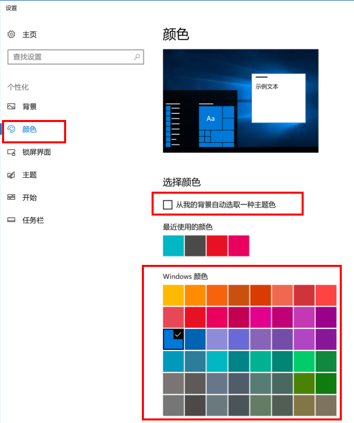 点击“颜色”,选择取消勾选“从我的背景自动选取一种主题色”复选框。根据屏幕提示,在颜色列表中,选择您喜欢的颜色。