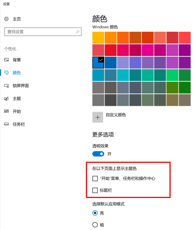 若您需要在““开始”菜单、任务栏和操作中心”或“标题栏和窗口边框”中显示主题色,勾选“在以下页面上显示主题色”中的相应选项。