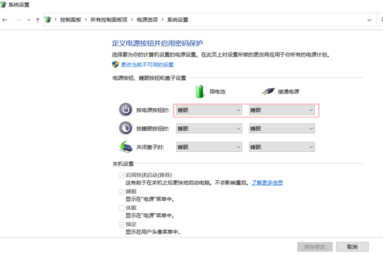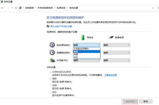 - 请选择 “选择电源按钮的功能”。 在按电源按钮时旁边,选择睡眠,然后选择保存修改。