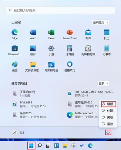 方案二:点击Windows图标,然后选择电源>睡眠,进入睡眠状态