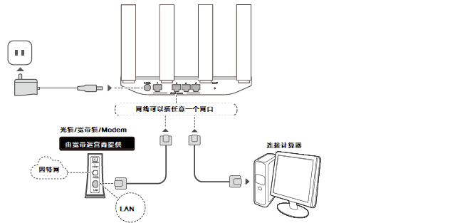 用网线连接路由器WAN/LAN 自适应接口和计算机。