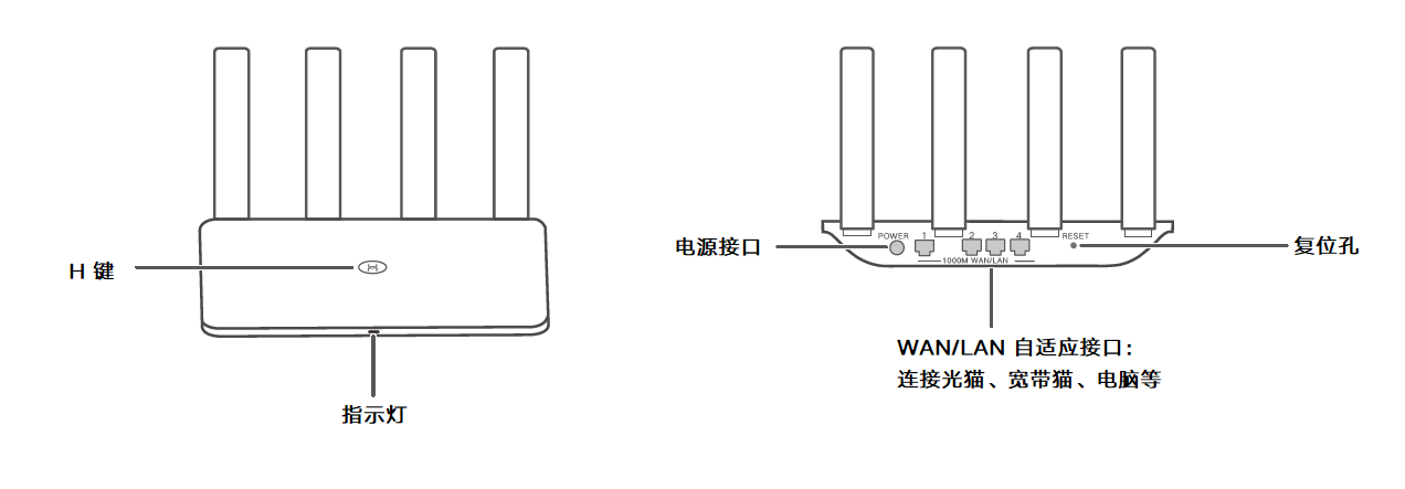 可连接因特网(如宽带猫、光猫等),也可连接电脑、电视盒子等。 网口盲插,入户网线插任意一个网口,均可以上网。 |