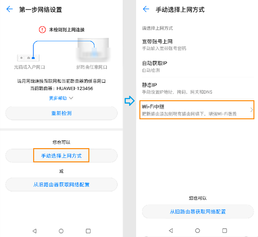 - 请点击手动选择上网方式 > Wi-Fi 中继。