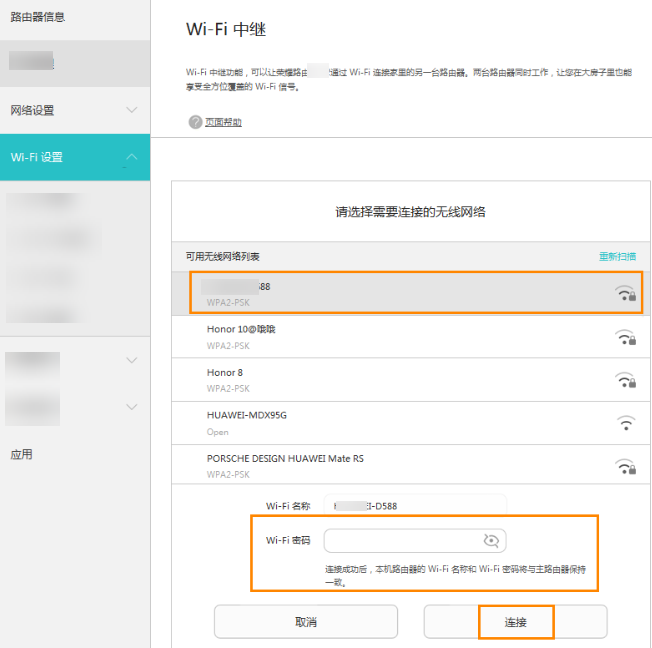 - 选择连接需要中继旧路由器的 Wi-Fi 并输入 Wi-Fi 密码,并跟随向导完成配置。。