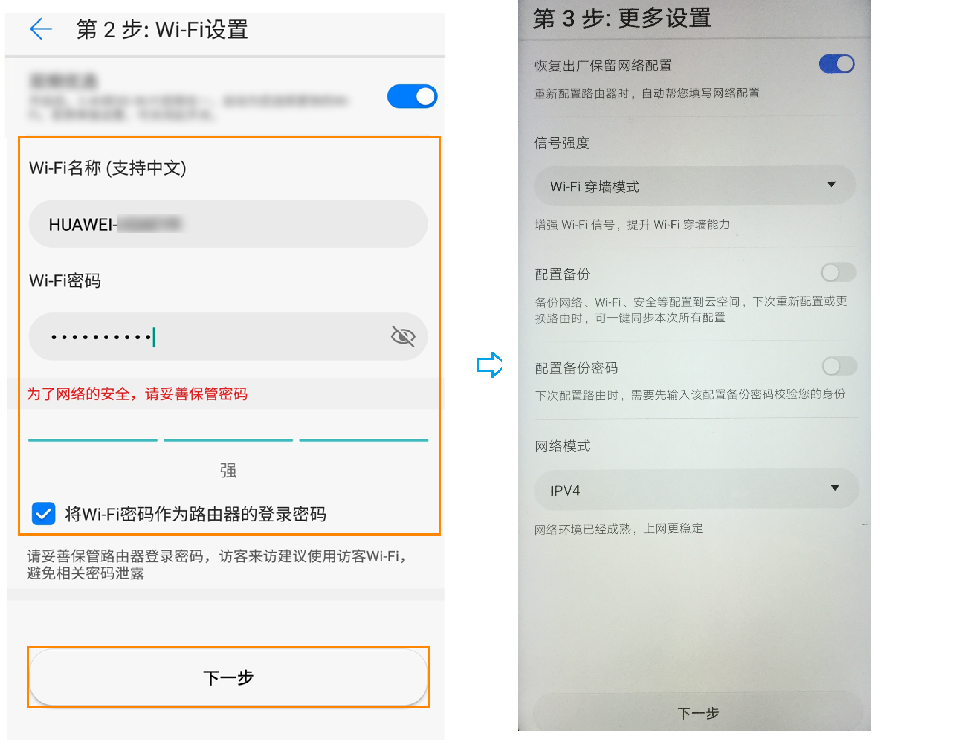 - 请设置路由器新的 Wi-Fi 名称和密码(可以将 Wi- Fi 密码作为路由器管理密码),以及其他参数,完成配置。
