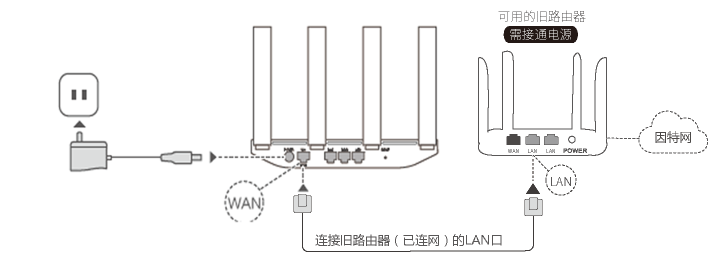 - 连接线缆:用网线将路由器的WAN/LAN 自适应网口连接到旧路由器的 LAN 接口。连接电源。