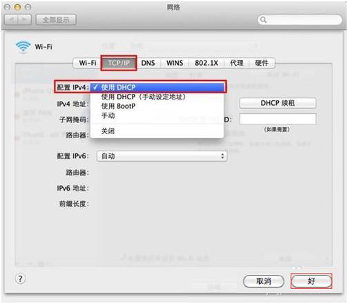 - 选择 TCP/IP,在配置 IPv4下拉框选择使用 DHCP,点击好。