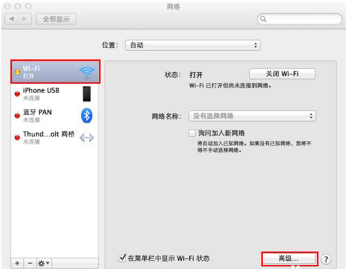 - 弹出网络的设置界面后,找到并点击 Wi-Fi,再点击高级。