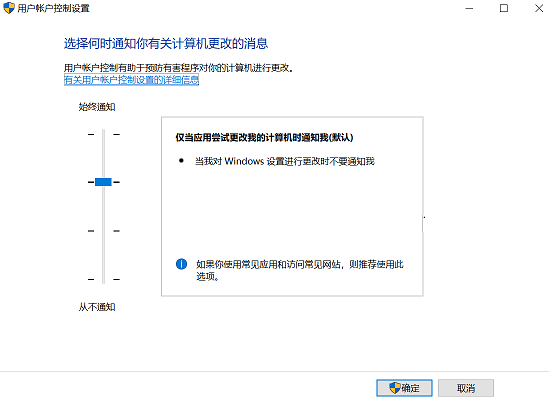 在搜索框输入更改用户帐户控制设置将设置改为仅当应用尝试更改我的计算机时通知我(默认)。