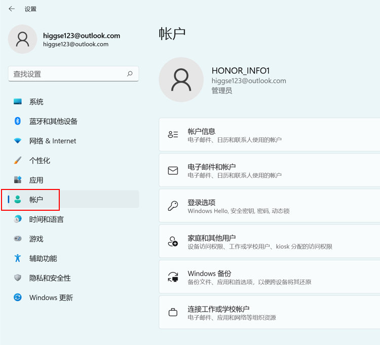 点击 Windows 图标 > 搜索设置,选择“帐户”。