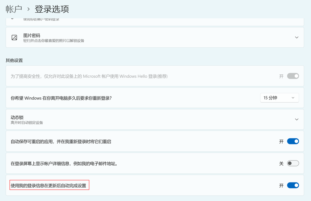 点击“登录选项”,在“其他设置”下打开或关闭“使用我的登录信息在更新后自动完成设置”。