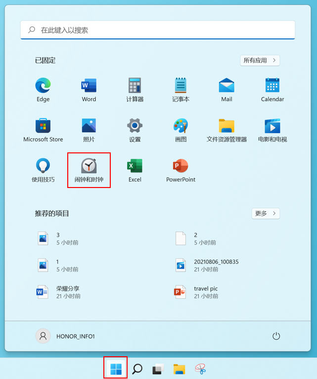 单击 Windows 图标,在程序列表找到“闹钟和时钟”并打开。