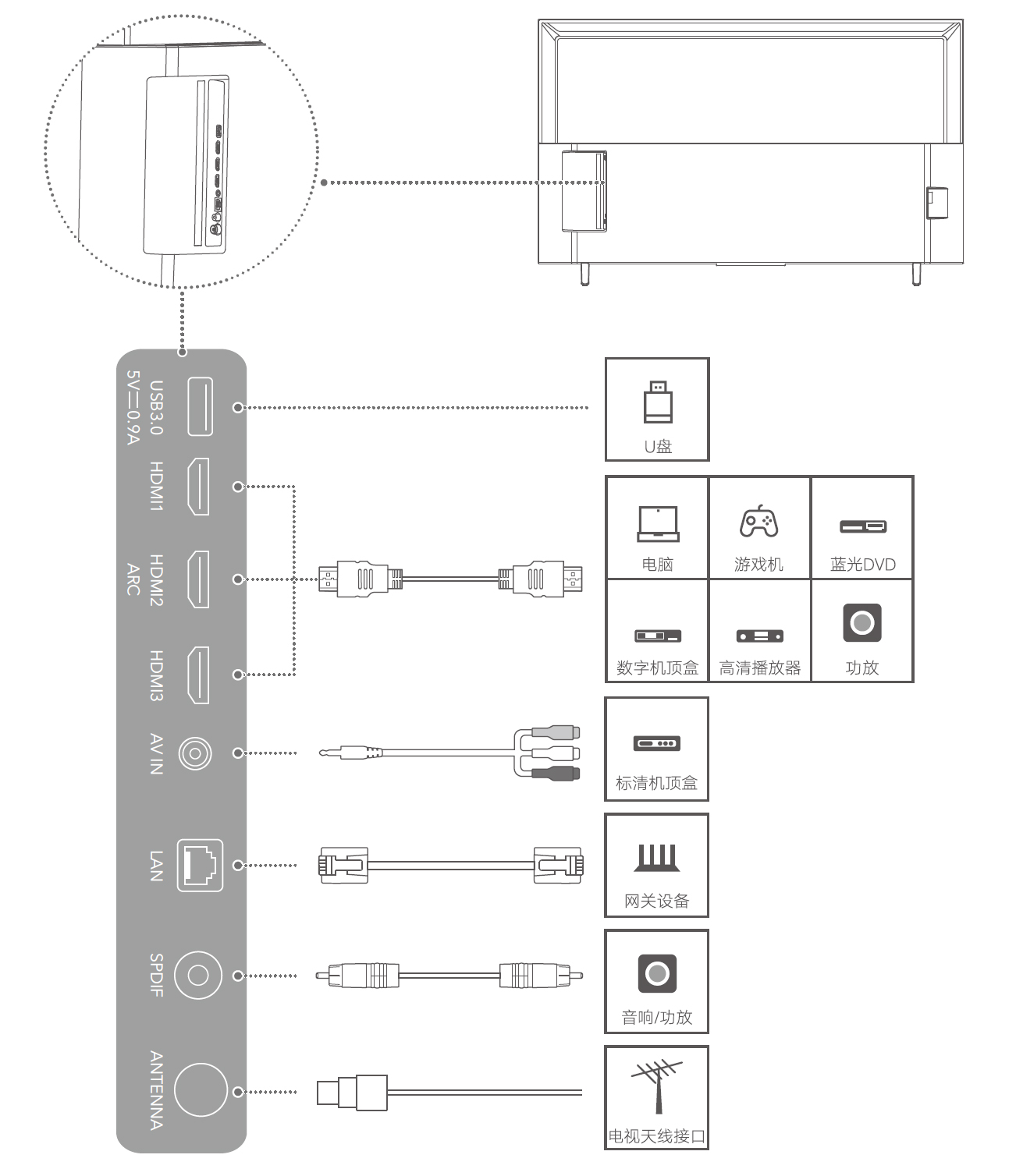 电脑、游戏机、蓝光DVD、数字机顶盒、高清播放器、功放等 功放需要连接到 HDMI2 接口。 |