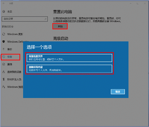 您可以通过 Windows 10 系统自带的恢复功能重置系统,将系统恢复到安装时的初始状态。