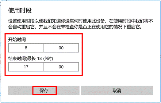 在“使用时段”界面设置使用该设备的开始时间和结束时间,并点击“保存”,Windows 将不会在该时段自动重启更新。
