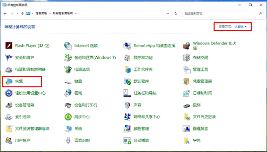 - 将“查看方式”修改为“大图标”,点击“恢复”。