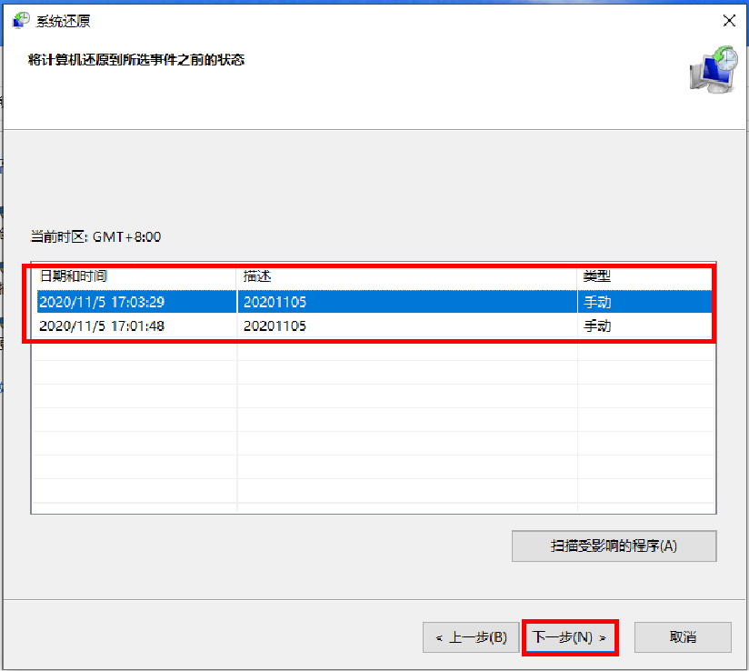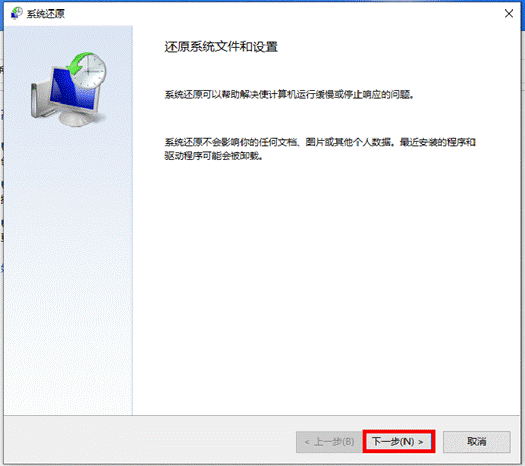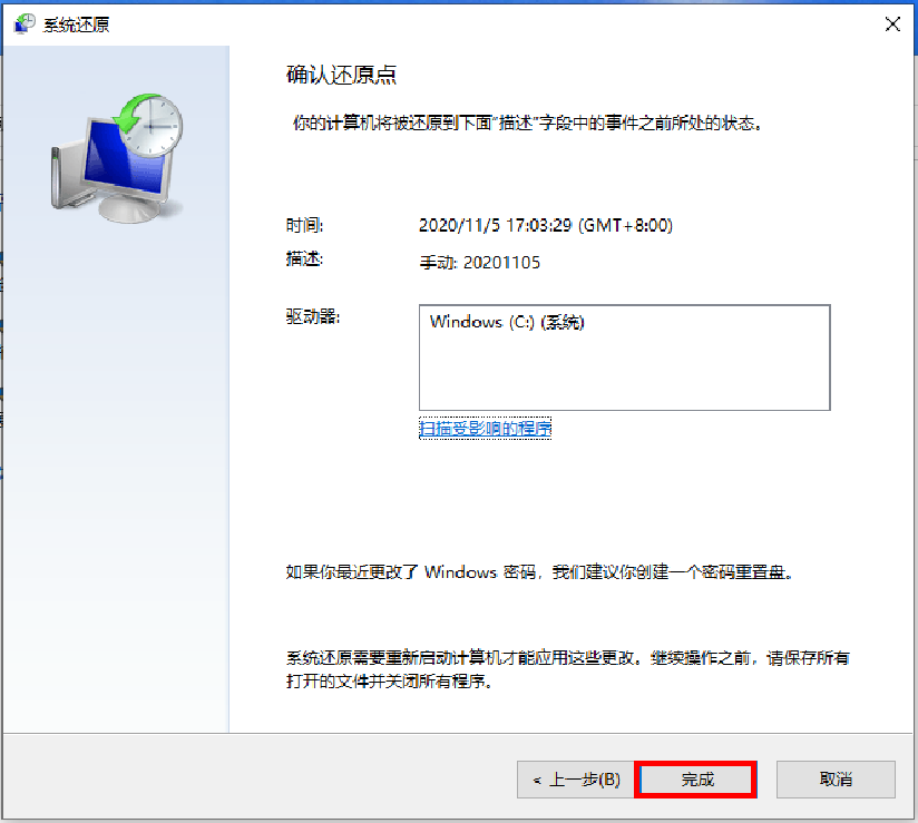 - 选择与有问题的应用、驱动程序或更新相关的还原点,然后依次选择“下一步”>“完成”。