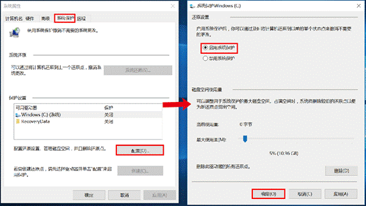 - 在“系统保护”选项卡,为 C 盘创建一个还原点。若 C 盘的“保护”处于关闭状态,首先需要点击“配置 > 启用系统保护 > 确定”来启用保护。