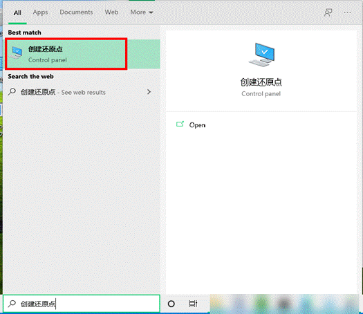 - 在任务栏上搜索框中,输入“创建还原点”并打开。