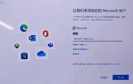 - 接受许可协议后,将进入微软账户登录界面。