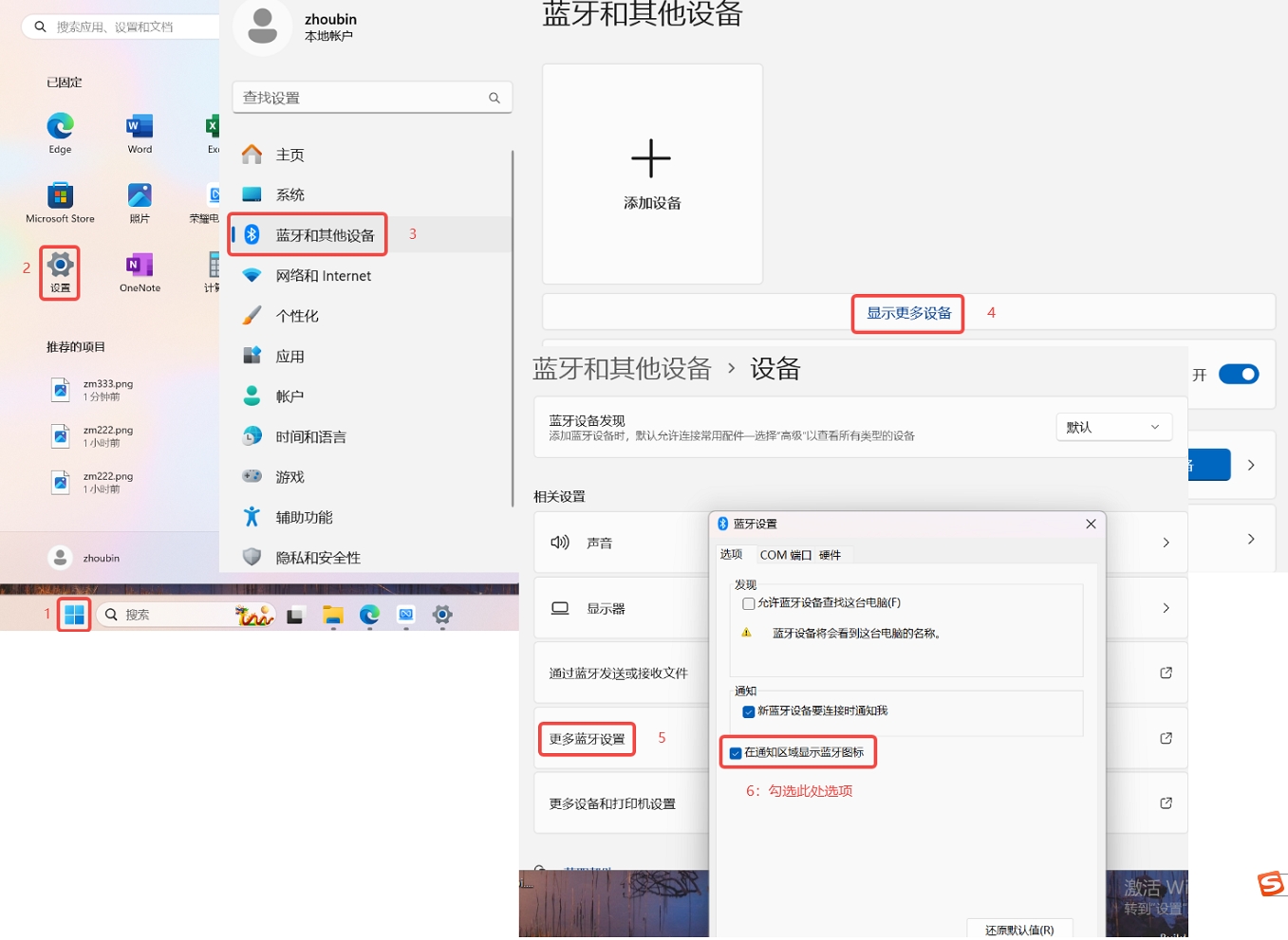 依次点击“开始>设置>蓝牙和其他设备>显示更多设备>更多蓝牙设置”,在蓝牙设置界面勾选“在通知区域显示蓝牙图标”。