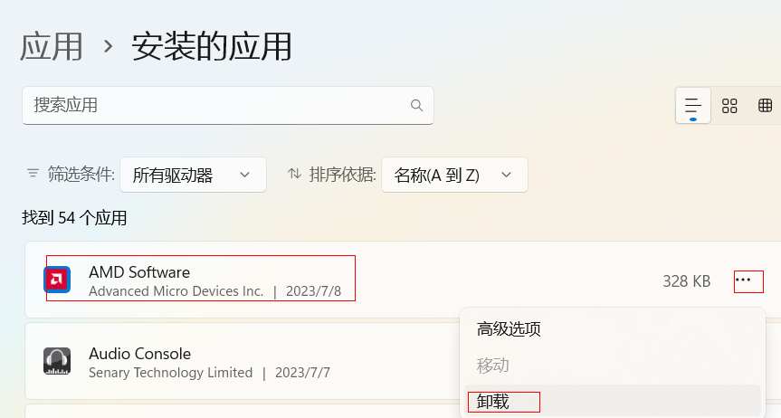 点击开始菜单,选择设置>应用>安装的应用,选择AMD Software点击卸载。