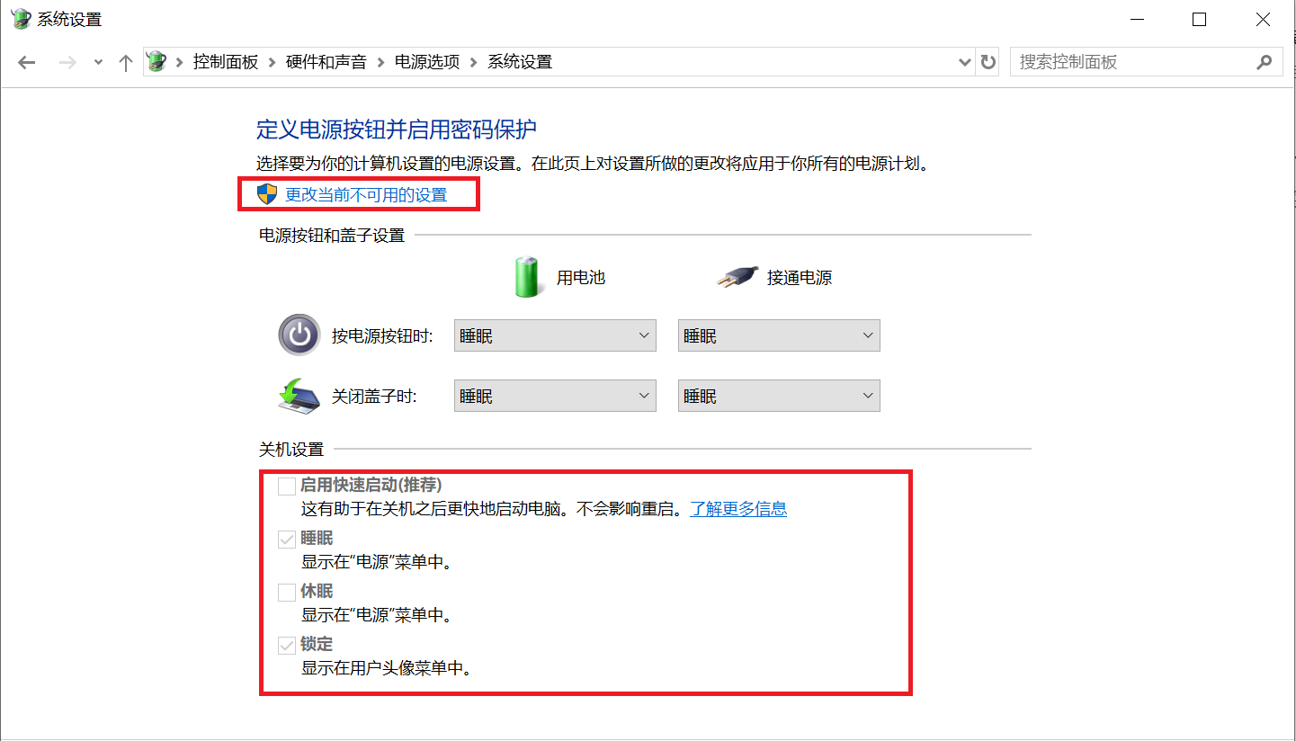 选择“更改当前不可用的设置 > 关机设置”,关闭“启用快速启动”、“睡眠”、“休眠”、“锁定”。