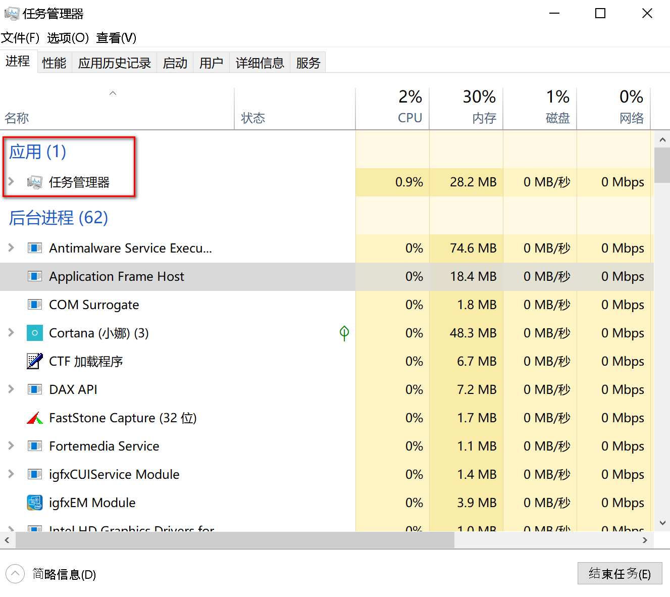 准备关机前,退出所有的应用程序,并使用键盘组合热键“Ctrl+Alt+Del”调出任务管理器,点击“查看 > 按类型分组”,查看应用下面的程序,选中 CPU 和内存或磁盘占用较高的程序,点“结束任务”,关闭后台运行的程序。关闭所有程序后,看是否还有关机慢的现象。